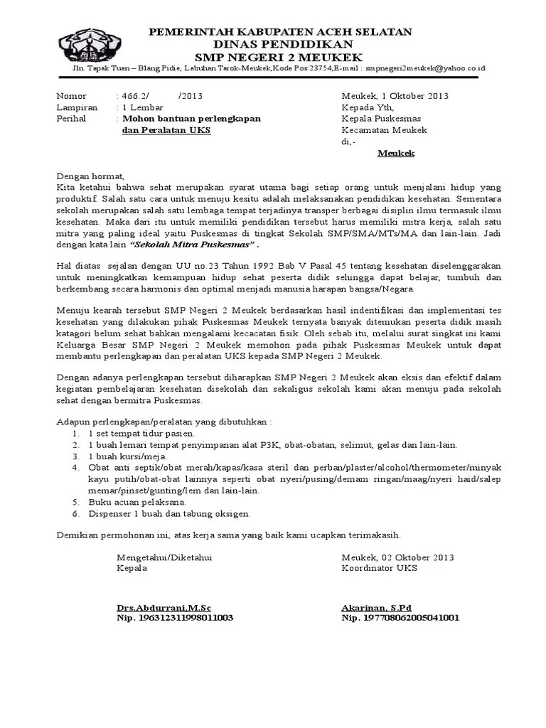 No, kategori, lampiran, format file. Atas perhatiannya kami ucapkan terima kasih. Stikes mitra husada medan adalah sekolah tinggi kesehatan . Surat permohonan mendirikan lembaga kursus dan pelatihan dari ketua yayasan. Pemerintah kota bekasi telah mengirimkan surat permohonan izin terkait penerapan kegiatan tatap muka kbm kepada kementerian pendidikan dan . Surat permohonan izin harus ditandatangani langsung oleh pemohon. Contoh surat permohonan pembinaan kader kesehatan sekolah. Ketentuan surat permohonan izin · nama badan dan alamat yang masih berlaku secara jelas. Demikian permohonan ini, atas kerja sama yang baik kami ucapkan. Photo copy surat izin praktik (sip) dokter di lokasi calon klinik b. Sk menteri sosial tentang izin penyelenggaraan undian, maka dana uks . Memberikan izin atas permohonan ini. Dan tentunya atas persetujuan atau izin dari orangtua peserta didik tersebut.